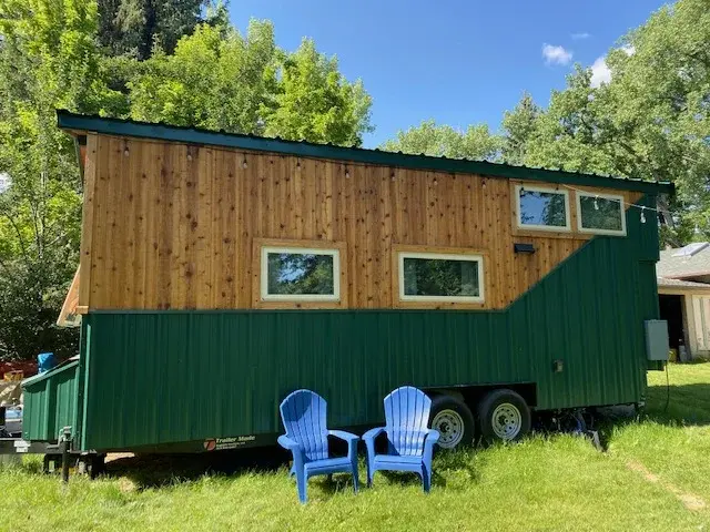 This custom designed tiny home fits all of the clients' wants and needs. Although compact, this couple won't miss out on any comforts of a standard home. Unique storage solutions and efficient design allow this space to comfortably sleep five people, as well as entertain with their fully stocked bar and kitchen. Complete with cedar bathroom, washer and dryer, and ski storage, this tiny house will provide a mortgage free mountain lifestyle for a young couple ready to hit the slopes.